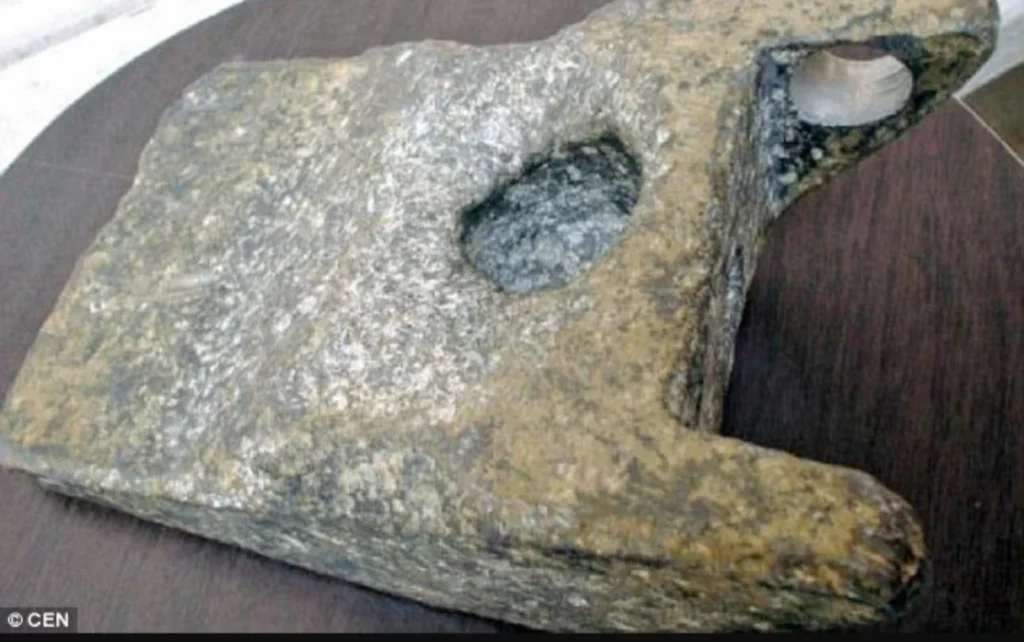 In China, a black, extremely hard stone was found containing a metal threaded bar, similar to a modern bolt. The stone is of volcanic origin, meaning it formed under intense heat and pressure.