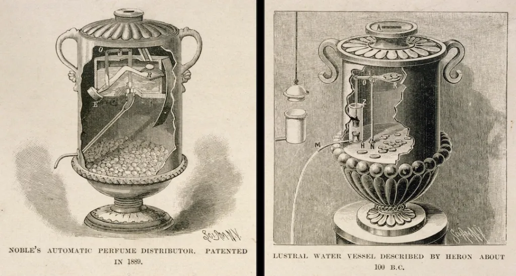 That same era also gave birth to another oddly modern idea: a coin‑operated dispenser used in temples to deliver a measured amount of holy water. When a coin was dropped into the machine, it tipped a small scale, opened a valve, and allowed liquid to flow out. Once the coin slid off, the scale returned and the valve closed. Strip away the ancient context and you basically have the ancestor of the vending machine and automated payment systems.