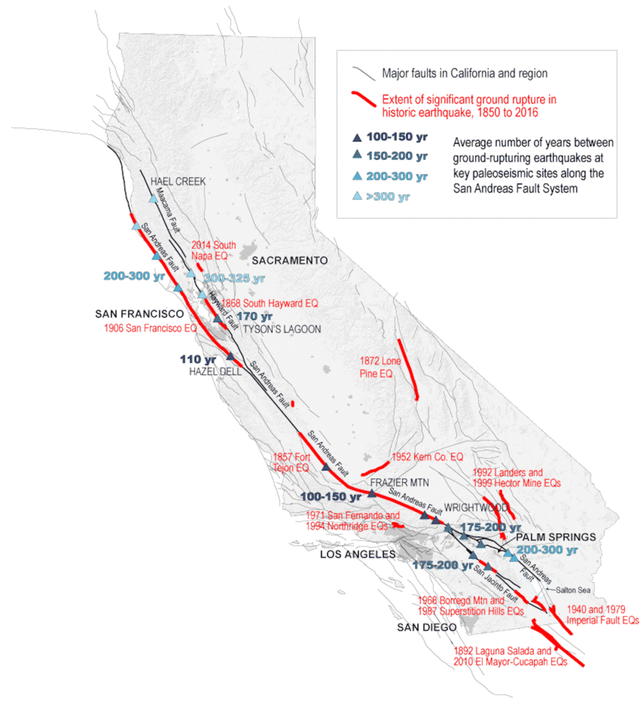 As for the “overdue” myth: While the 1857 earthquake in Southern California suggests a 100-150-year cycle, faults don’t work on a timeline. Stress might release tomorrow, or it could take decades.