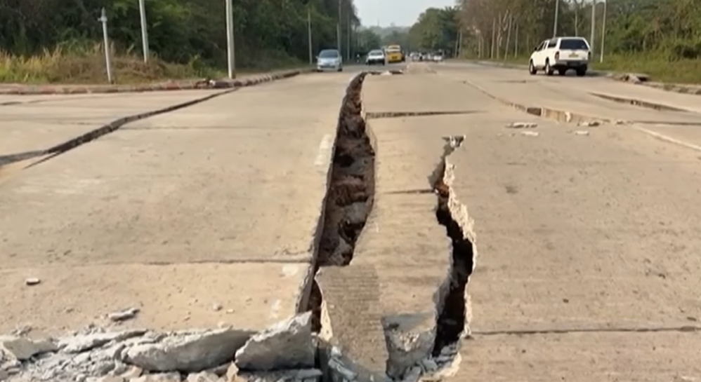 A cracked highway in Myanmar in March 25. Source: YouTube/Channel 4